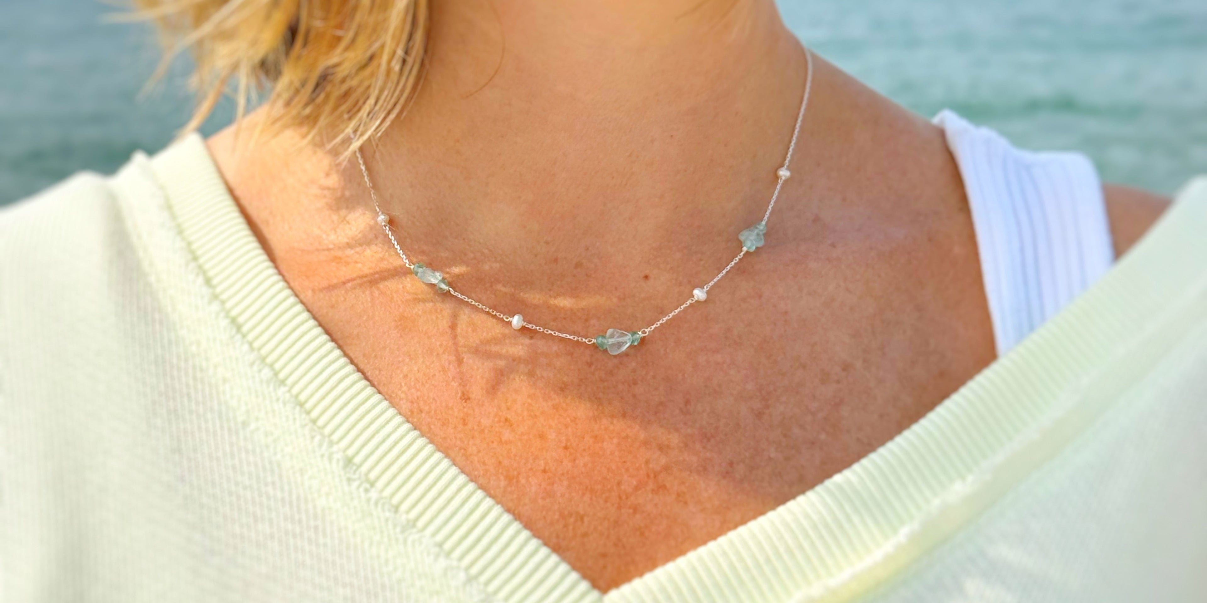 Truro Necklace - sterling silver, freshwater pearl, aquamarine